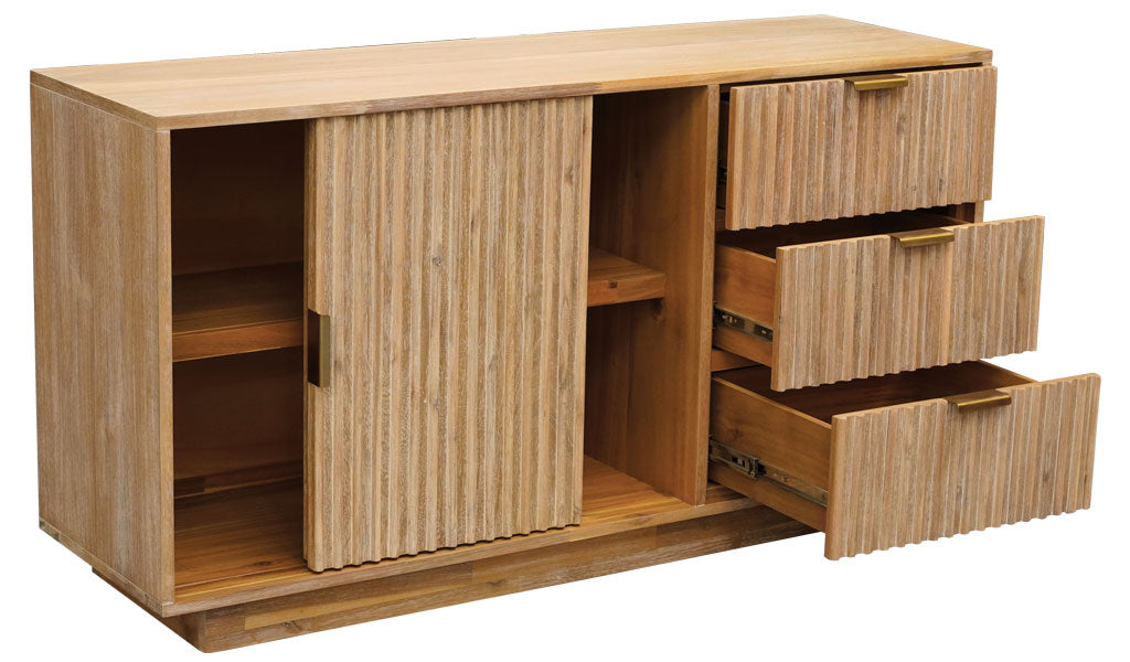 The Cube Buffet is a modern statement piece that combines sleek design with practical storage. Crafted from light-stained acacia wood, it features distinctive ribbed detailing that adds texture and visual interest, making it a stylish focal point in any dining or living space. The natural tones of the wood bring warmth and sophistication to contemporary interiors.